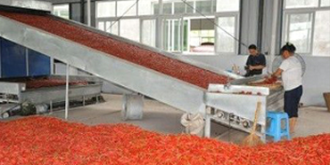 二、匡老五辣業(yè)除了有大型規(guī)范的種植基地外,同時配套了相應(yīng)的3000多噸的標(biāo)準(zhǔn)化冷庫,以及處理烘干80多噸鮮椒的蒸汽烘烤流水線設(shè) 備,即能掌控辣椒的干度,又保證干辣椒色澤的均勻紅亮。